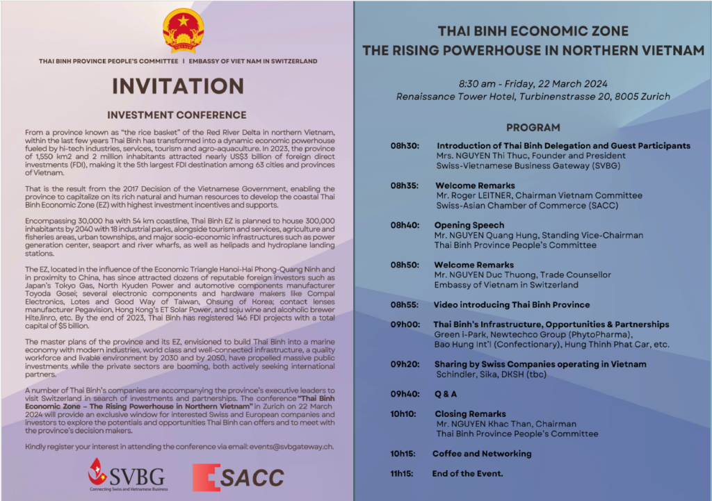 The Swiss-Vietnamese Business Gateway (SVBG), in collaboration with the Swiss-Asian Chamber of Commerce (SACC), organizes a business conference in Zurich on 22 March 2024, aiming to introduce and connect opportunities for partnership between Swiss/European companies and a rising provincial economy in Vietnam.